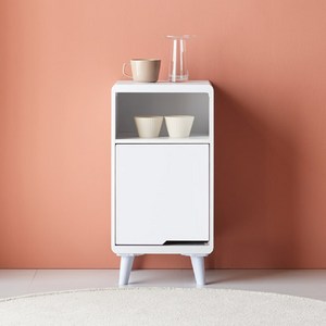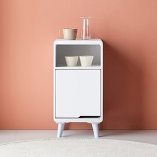 좁은 공간에도 배치 가능한 슬림한 틈새장으로, 도어형 수납구조와 깔끔한 올화이트 컬러로 주방 정리에 적합함.
