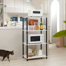 블랙과 화이트 조합의 4단 다용도 주방 선반으로, 전자렌지와 오븐 등 다양한 가전을 깔끔하게 수납할 수 있는 미니 틈새 수납장임.