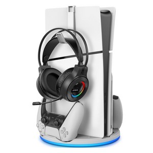 플스5 프로와 슬림 버전 모두 호환되는 올인원 멀티 쿨링스탠드로, 컨트롤러 충전과 헤드셋 거치가 가능한 화이트 스탠드입니다.